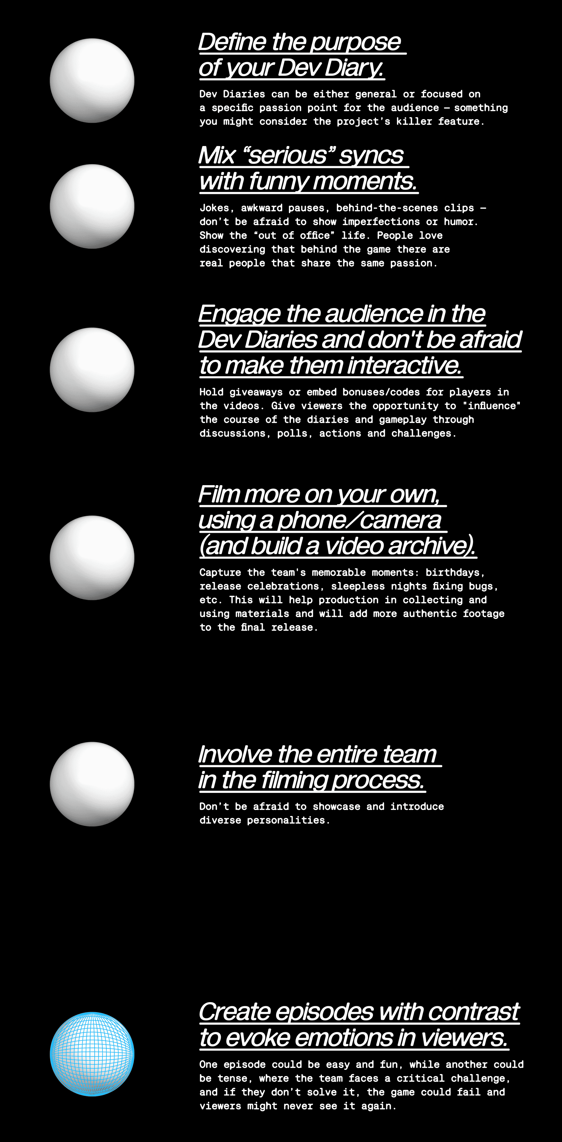 Next time we'll talk about top-tier versions of DevDiaries and how they help games make a big impression. The choice between simple and elaborate DevDiaries depends on your project's scale, budget and marketing goals.