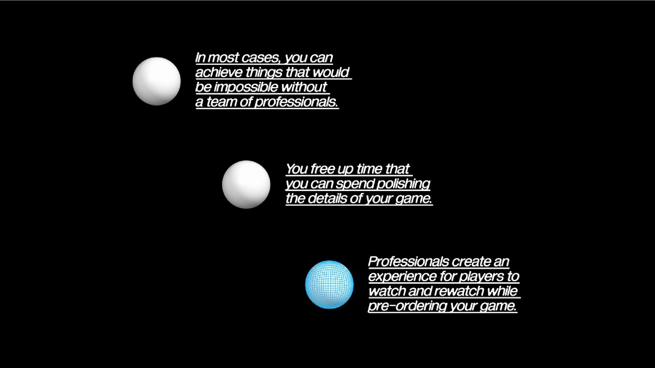 It’s a complicated project with many tasks: coordinating film crews, getting shooting permissions, handling schedules and managing post-production. Each step has its own challenges, like turning office spaces into sets or organizing shoots abroad. Save time by letting experts handle the production, so your team can focus on creating great games.